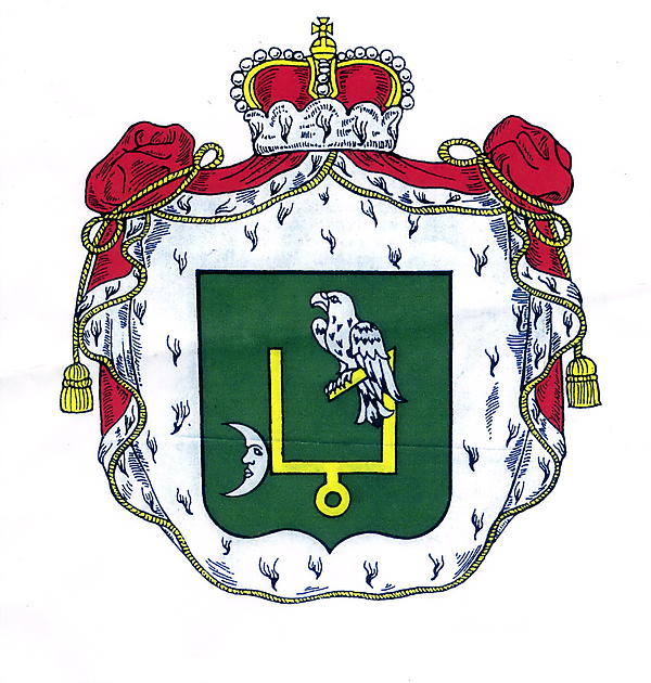 Описание герба: Выписка из Гербовника В зелёном поле тамга, на перекладине которой сидит кречет, справа снизу - серебряный полумесяц. Щит покрыт княжеской мантией и короной. |