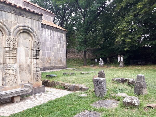 Архитектурный ансамбль Манглисского собора включает храм, отдельно построенную колокольню, кладбище, руины бывших хозяйственных зданий и ограждение.