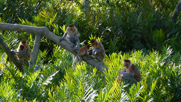 Некоторые обезьяны являются всеядными. Мартышки в Западной Африке едят и крабов-скрипачей, и цветки, плоды и молодые лиситья ризофоровых. Макаки в Юго-Восточной Азии употребляют в пищу крабов, моллюсков и проростки ризофор. Находясь среди проростков, они повреждают их больше, чем съедают, нанося этим существенный ущерб мангровой растительности, препятствуя возобновлению мангровых экосистем. К исключительно растительноядным относятся тонкотелые обезьяны, в том числе лангуры и носачи. Носачи встречаются исключительно на Калимантане в мангровых и произрастающих вдоль рек лесах. Тонкотелые обезьяны питаются главным образом листьями, в меньшей степени лепестками и фруктами. Для переваривания пищи, особенно трудноперевариваемой листвы, они имеют сложный и многокамерный желудок[19].
