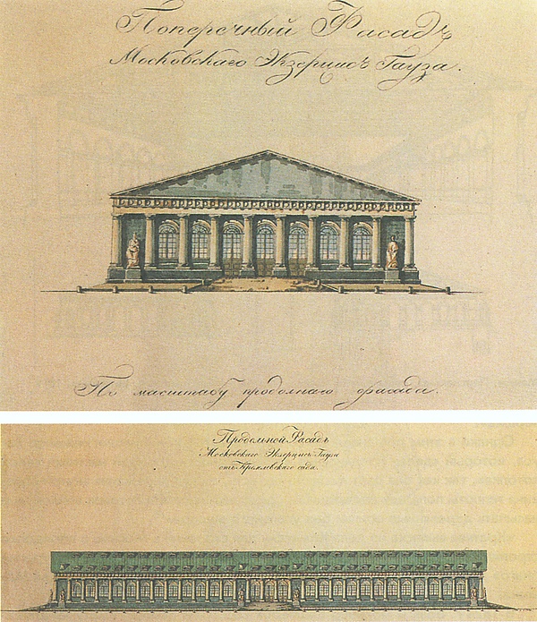В 1816 году Александр I отдал распоряжение о строительстве Экзерциргауза, как назывались манежи в те времена. После ввода русских войск в Париж в 1814 году император был удовлетворён слаженностью их шага, поэтому регулярно устраивал военные парады и смотры[6]. Здание было предназначено для строевой подготовки войск численностью до двух тысяч человек, также удобным было место — рядом с выходом из Кремля через Троицкую и Кутафью башни, поблизости от расположений полков[8].