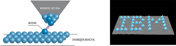 Идеальный процесс создания наноструктур — это сборка атом за атомом, как предлагал Ричард Фейнман в своей пророческой статье 1960 года[1]. С развитием сканирующей зондовой микроскопии (СЗМ) эта фантастическая перспектива стала реальностью. В настоящее время среди различных подходов СЗМ показала себя как наиболее простой и удобный метод манипулирования атомами. Дополнительное достоинство СЗМ — это то, что её можно использовать не только как исследовательский прибор, но и как инструмент для воздействия на атомы поверхности. Используя межатомные силы между «последним» атомом иглы и атомом на поверхности, а также электростатические силы, действующие со стороны иглы на поверхность, или же токи высокой плотности, можно цеплять атомы к игле, перемещать их по поверхности в нужное место, удалять ненужные, осаждать дополнительные атомы с иглы. То есть, для атомных манипуляций и наблюдения служит один и тот же прибор: можно сначала осмотреть поверхность, выбрать объект для манипуляций, произвести их, а затем проверить результат.