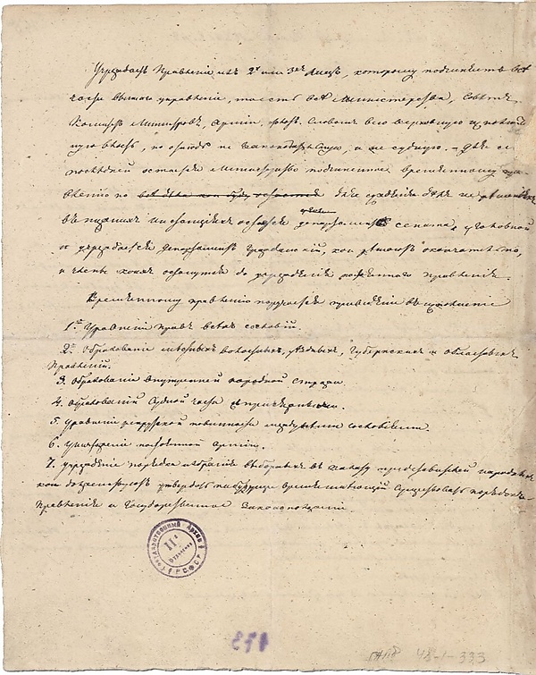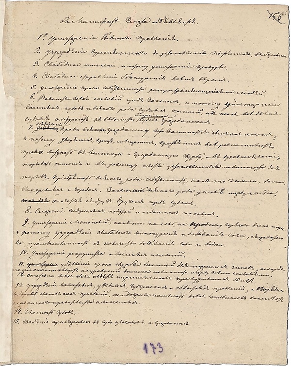 Документ представляет собой план манифеста от имени Правительствующего сената, который предполагалось обнародовать в случае успеха декабристского выступления. Он содержит перечень первоочередных политических и социальных преобразований, отражающий основные положения программы Северного общества.