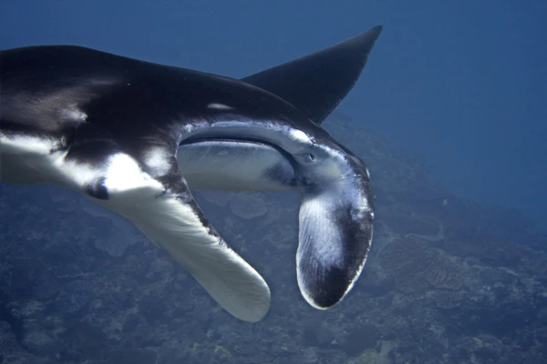 Передняя часть грудных плавников преобразована в так называемые головные плавники. Длина головных плавников в 2 раза превышает ширину их основания. На движении манты обычно сворачивают головные плавники по спирали в виде «рожек», а во время кормления расправляют и с их помощью направляют поток воды с планктоном в рот. Расстояние от кончика хвоста до клоаки примерно равно расстоянию от клоаки до кончика рыла. Хвост слегка приплюснут и немного короче диска. Рыло между головными плавниками чуть вогнуто[7].