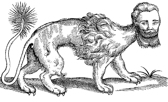Он (Ктесий) уверяет, что индийский зверь «мартихора» имеет тройной ряд зубов на обеих, — нижней и верхней челюстях, и он величиной со льва и настолько же волосат, его ноги походят на ноги льва; его лицо и уши имеют сходство с человеческими; его глаза голубые, а сам он ярко-красного цвета; хвост его такой же как и у земляного скорпиона, — в хвосте у него жало и он имеет способность выстреливать, как стрелами, иглами прикреплёнными у него к хвосту; голос его нечто среднее между звуком свирели и трубы; он может бегать так же быстро как олень и ещё он дикий и людоед.