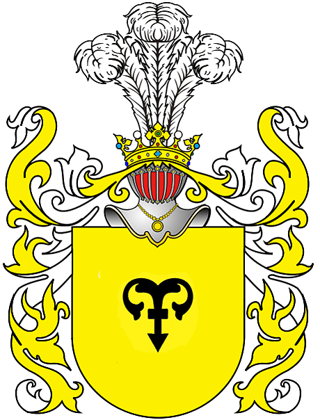 В золотом поле чёрная опрокинутая и перекрещенная стрела с развёрнутым надвое перьем.
