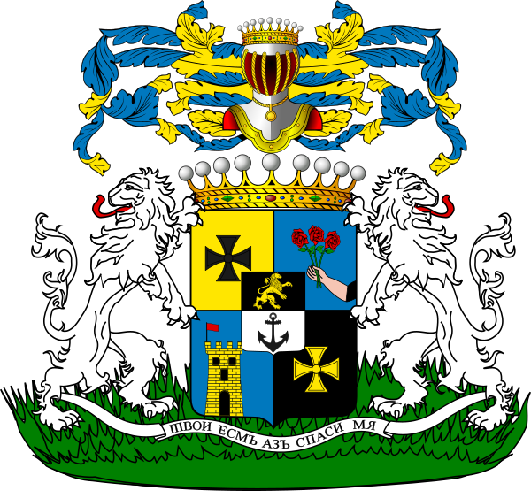 В первой части в золотом и четвёртой в чёрном полях, изображено по одному кресту переменных с полями цветов. Во второй части в голубом поле видна выходящая с левой стороны рука, держащая ветвь с тремя розами. В третьей части в голубом же поле золотая башня с четырьмя на ней зубцами и с Флагом.