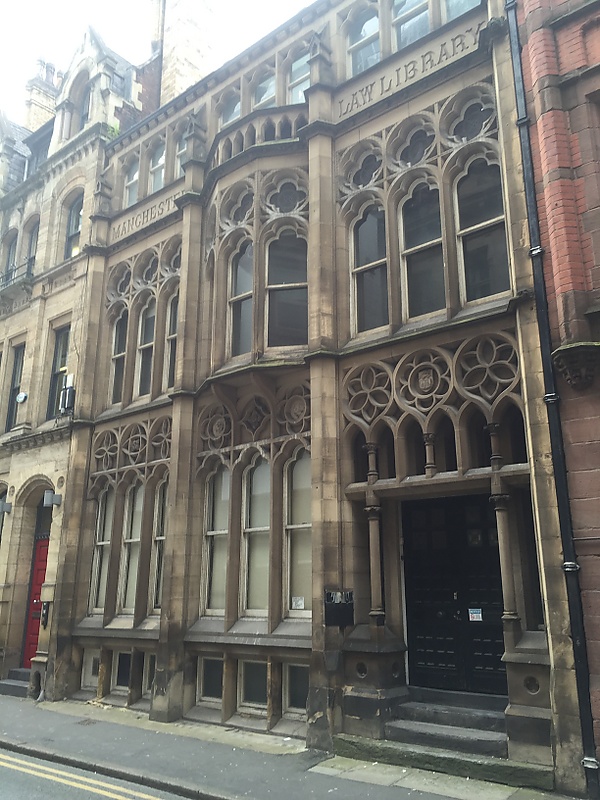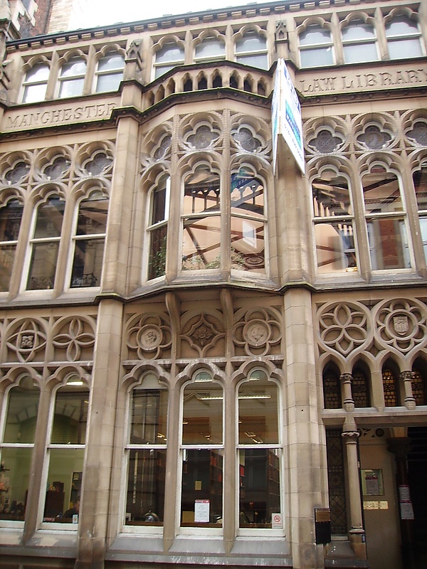 Бывшая Манчестерская юридическая библиотека является памятником архитектуры II степени [2] в стиле венецианской готики[3] по адресу Кеннеди-стрит, 14, Манчестер. «Здание примечательно тем, что оно было построено для целей юридической библиотеки и, не считая Лондона и старых университетов, считается, что оно выполняло эту функцию дольше, чем любая другая провинциальная юридическая библиотека». [4]