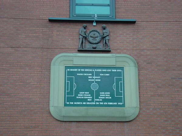 В разгаре сезона 1957/58, по возвращении домой из Белграда после матча Кубка европейских чемпионов с «Црвеной Звездой», самолёт с игроками «Юнайтед» потерпел крушение в аэропорту Мюнхена 6 февраля 1958 года. Авиакатастрофа отняла жизни восьмерых футболистов — Джеффа Бента, Роджера Берна, Эдди Колмана, Дункана Эдвардса, Марка Джонса, Дэвида Пегга, Томми Тейлора и Лиама Уилана — и ещё пятнадцати пассажиров, включая членов тренерского штаба клуба Уолтера Крикмера, Берта Уолли и Тома Карри[37][38]. Мэтт Басби получил тяжёлые травмы, но выжил, и спустя три месяца вернулся к руководству клубом. К удивлению многих, лишённый игроков основного состава «Юнайтед» достиг финала Кубка Англии 1958 года, в котором уступил «Болтону». В конце сезона УЕФА предложил Футбольной ассоциации Англии заявить в Кубок европейских чемпионов два клуба — чемпионов Англии «Вулверхэмптон Уондерерс» и «Манчестер Юнайтед», в дань памяти жертвам авиакатастрофы, но Футбольная ассоциация отклонила это предложение[39][40]. В сезоне 1958/59 «Юнайтед» завершил чемпионат на 2-м месте[34].