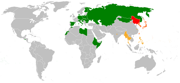 Лига Наций отказалась признавать Маньчжоу-Го, что привело Японию к выходу из этой организации в 1934 году. В то же время Маньчжоу-Го было признано 23 из 80 существовавших на тот момент государств мира. Дипломатические отношения были установлены с СССР (де-факто 23 марта 1935; де-юре 13 апреля 1941)[4][5][6][7], Германией, Италией, Испанией, позже — режимом Виши во Франции. В частности, государство признали: