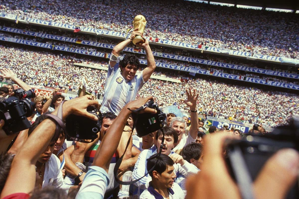 Наиболее значимым турниром в карьере Марадоны оказался чемпионат мира 1986 года в Мексике, где он выводил соотечественников на поле в качестве капитана, сыграл каждую минуту каждого матча команды, в том числе в победном финале со сборной ФРГ. С пятью голами и пятью результативным передачами завоевал «Золотой мяч», награду лучшему игроку чемпионата. Особую известность получил четвертьфинальный матч с Англией, имевший принципиальное значение из-за прошедшей между странами Фолклендской войны. Матч завершился победой Аргентины со счётом 2:1. Оба гола за команду забил Марадона, и каждый из них вошёл в историю футбола. В первом случае нападающий в начале второго тайма направил мяч в ворота кулаком — арбитр не увидел нарушения и зафиксировал взятие ворот. На послематчевой пресс-конференции Диего настаивал на том, что ударил по мячу головой, а в ворота он попал благодаря «руке Бога». Много лет спустя Марадона всё же признал, что сыграл в том моменте рукой, и принёс извинения обслуживавшему матч тунисскому судье Али Бин Нассеру[15]. Второй гол в том матче был оформлен спустя четыре минуты: Марадона пробежал с мячом половину поля, обыграв на финтах и дриблинге нескольких полевых игроков и вратаря, после чего поразил пустые ворота. «Гол столетия», как его назвали в прессе, был признан FIFA лучшим голом в истории чемпионатов мира в XX веке[16].