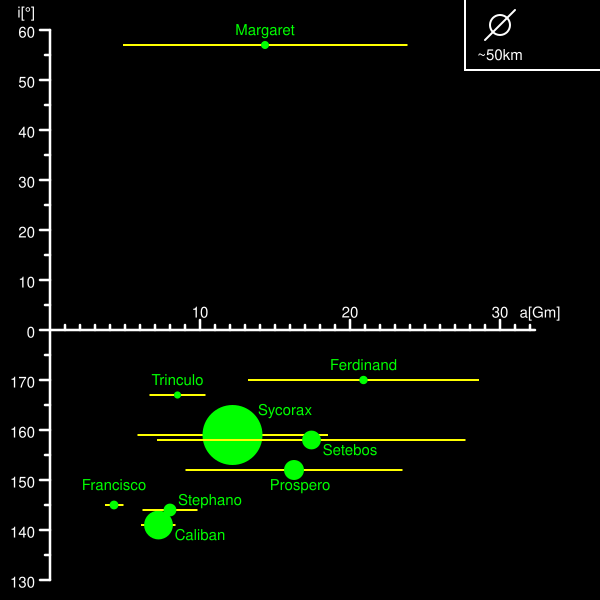 Особенностью Маргариты является то, что она — единственный нерегулярный спутник Урана с прямым орбитальным обращением. На диаграмме показаны орбитальные параметры Маргариты, уникальные среди нерегулярных спутников Урана, с наклонением по вертикальной оси и эксцентриситетом орбиты, выраженным горизонтальными отрезками от перицентра до апоцентра.