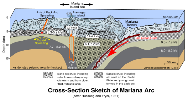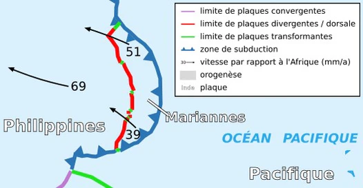 Она отделена от Филиппинской плиты дивергентной границей с многочисленными трансформными разломами. Предел Марианской и Тихоокеанской плит есть зона субдукции Тихоокеанской плиты. Ограничена Марианским жёлобом на юге и Идзу-Огасаварским желобом на северо-востоке[1].