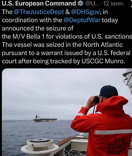 В декабре 2025 года в течение двух недель власти США предпринимали попытки задержать танкер в Карибском море, однако «Маринера» уходила от преследователей[12][13][9]. 6 января 2026 года МИД РФ заявил, что с тревогой отлеживает ситуацию с танкером, который подвергся преследованию со стороны США и НАТО уже в Северной Атлантике, что, по мнению ведомства, «явно не соразмерно его мирному статусу»[14]. 7 января 2026 года Европейское командование ВС США сообщило о задержании «Маринеры» в связи с «блокадой подсанкционной и незаконной венесуэльской нефти»[15][16]. Отмечалось, что операция по захвату проводилась совместными усилиями Минюста США, Министерства внутренней безопасности и Пентагона[17].