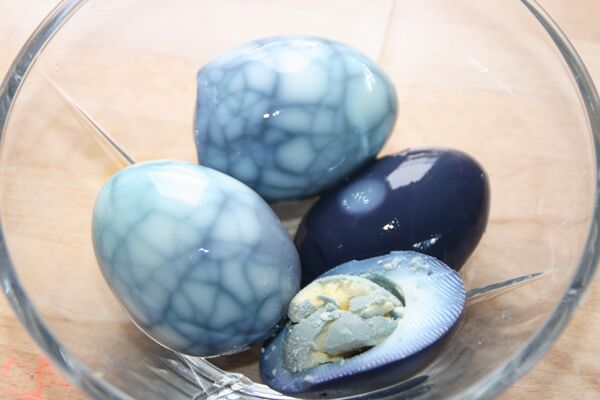 Рецепт пенсильванских немцев имеет особенность: яйца маринуют со свёклой и луком, маринад делают на основе уксуса с сахаром, солью, гвоздикой и корицей[4]. Благодаря свёкле готовые яйца имеют розовый цвет и кисло-сладкий вкус и являются популярной закуской на пикниках и вечеринках. В Дании маринованные яйца готовят в скорлупе, мелко надколотой при катании варёного яйца по столу.