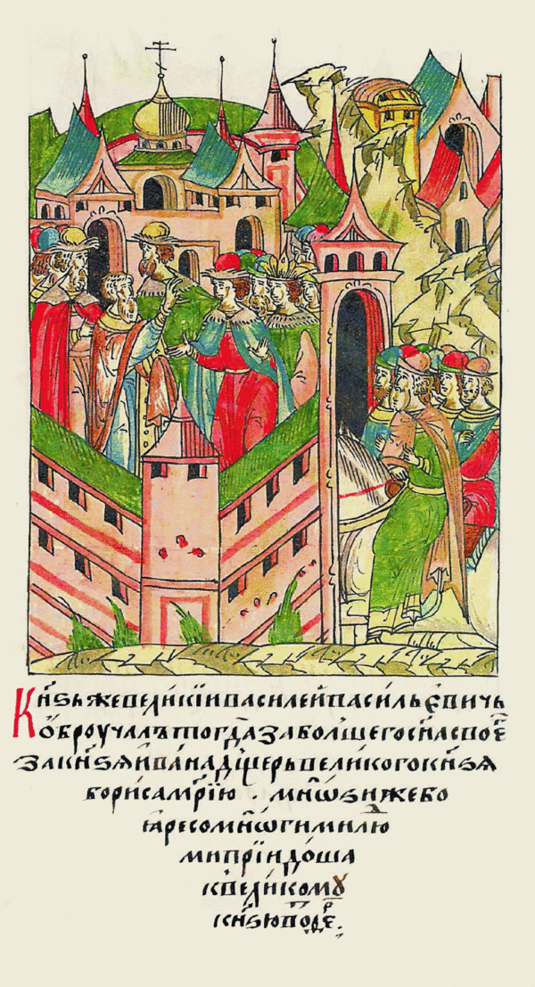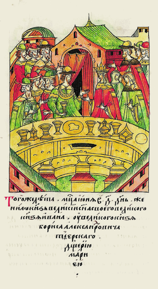 Обручение 7-летнего «князя Ивана Горбатого, тако же бо зва его отец» с 5-летней дочерью тверского князя Марией состоялось во время пребывания отца жениха Василия II в Твери. Тверич инок Фома, составивший около 1453 года «Похвальное слово» тверскому князю, отмечает торжественную обстановку, в которой совершилось обручение, и его значение для обеих сторон: «И был на обручение том боголюбивый епископ Тферскый Илиа и вси князи и велможии и елико их под областию великого князя Бориса и з другиа страны сам князь великий Василей, а с ним князей и боар множество, таковей бо тесноте сущи, но якож ни граду их не вместити. И быс радос велиа, но якож и преди рекохом обратил бог плач на радость и москвичиж радовашес, яко учинис Москва Тферь, а тферичи радовашеся, якож Тьферь Москва быс и два государя воедино совокупишася»[1][2].