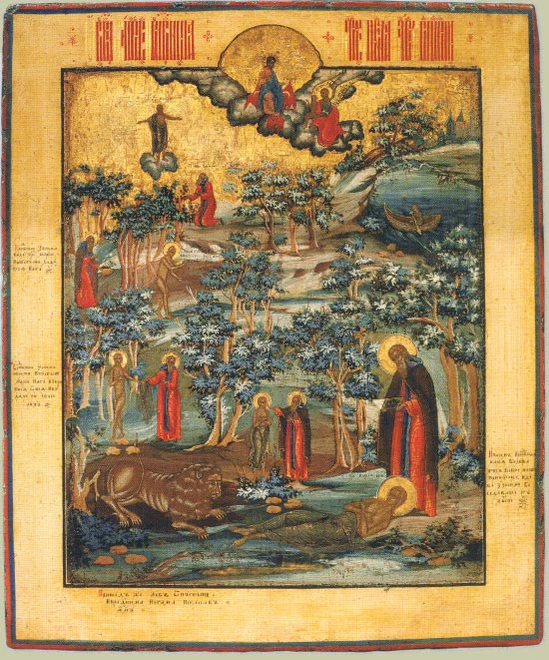 Послушав этого повеления, Мария приняла причастие и, перейдя Иордан, поселилась в пустыне, где провела 47 лет в полном уединении, посте и покаянных молитвах[2]. Первые 17 лет (до 46 лет) Марию преследовали блудные страсти и воспоминания о прошлой жизни: