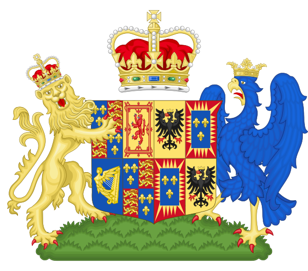 Герб Марии основан на гербе её мужа, объединённом с гербом её отца[136]. Щит увенчан короной святого Эдуарда. Щитодержатели: на зелёной лужайке золотой, вооружённый червленью и коронованный такой же короной леопард [восстающий лев настороже] и лазоревый орёл, коронованный золотой тиарой и вооружённый червленью.