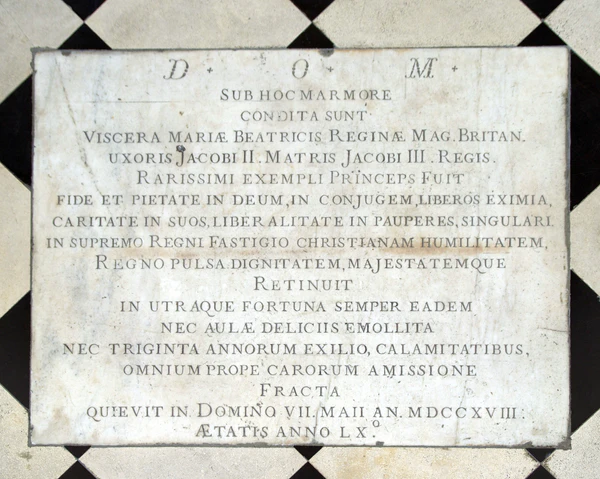 Щит разделён надвое: справа — английский королевский герб Стюартов (начетверо: в первой и четвёртой частях королевский герб Англии [в 1-й и 4-й частях в лазоревом поле три золотых лилии (французский королевский герб), во 2-й и 3-й частях в червлёном поле три золотых вооружённых лазурью леопарда (идущих льва настороже), один над другим (Англия)]; во второй части в золотом поле червлёный, вооружённый лазурью лев, окружённый двойной процветшей и противопроцветшей внутренней каймой [Шотландия]; в третьей части в лазоревом поле золотая с серебряными струнами арфа [Ирландия])[137]. Слева элементы герба дома д’Эсте (начетверо): в первой и четвёртой частях — в золотом поле чёрный, вооружённый червленью и коронованный золотом орёл [Модена]; во второй и третьей частях — в лазоревом поле с червлёно-золотой заострённой каймой три золотых лилии [Феррара][138].