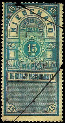 Марки Киевского окружного суда в пользу рассыльных номиналами в 15 и 30 копеек вышли в 1886 году. Они были отпечатаны типографским способом синей краской на белой бумаге. На миниатюрах дан текст в орнаментальном оформлении: «Кіевскаго окружнаго суда марка в пользу разсыльныхъ».[2][3]