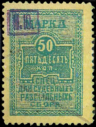 В 1920 году Главное командование Вооружёнными силами Юга России (ГК ВСЮР) выпустило марку для оплаты доставки судебных документов. Её рисунок напоминал рисунок марки канцелярского сбора общегосударственного выпуска Российской империи 1887 года. На фигурном щитке цифрами и словами был указан номинал: «50 пятьдесятъ коп.». Выше щитка располагалось слово «марка», ниже в четыре строки — «спец. для судебныхъ разсыльныхъ сбора». Миниатюры были отпечатаны литографским способом серовато-голубой краской на белой рыхлой или сероватой бумаге без водяных знаков. В верхнем левом углу каждой марки имеется фиолетовая контрольная надпечатка — в прямоугольной рамке буквы «М. Ю.» (Министерство юстиции).[2][4]