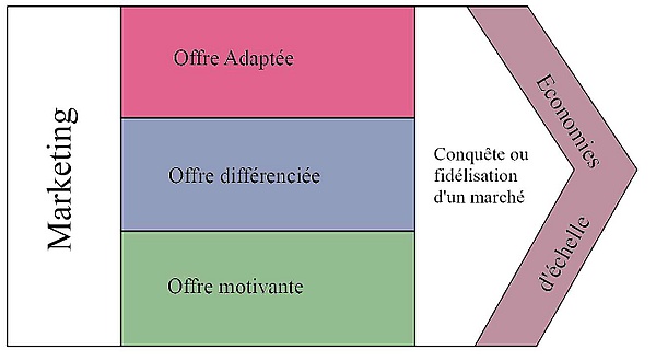 По Жаку Лендреви и Жюльену Леви (Mercator): «Маркетинг — это средство влияния, используемое организациями для формирования поведения зависимых от них групп в свою пользу». А именно, адаптация в конкурентной среде ради предложения, ценность которой стабильно превосходит альтернативные[16].