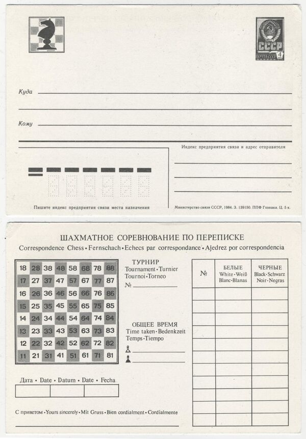 Шахматные карточки — вид маркированных почтовых карточек специального назначения, предназначенных для игры в шахматы по переписке[18]. В СССР такие карточки выпускались с 1968 года[18].