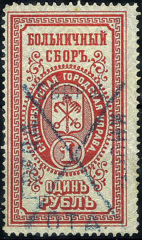 Больничные марки выпускало также Псковское земство. В 1918 году марка больничного сбора стоимостью один рубль была выпущена в Рыбинске. Сбор проводился при операциях с паспортом старого образца или при выдаче властями каких-либо справок, на которые наклеивалась марка. Она была красно-коричневого цвета, без зубцов; внутри овала располагался герб Рыбинска, по периметру овала шла надпись «Рыбинский городской отдел»; в нижней части прямоугольной рамки текст «За 1918 год». Тираж марки и время её обращения неизвестны[5].