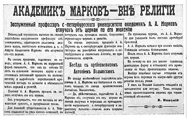Ещё в 1901 году академик Марков резко протестовал против решения Синода об отлучении Льва Толстого. 12 февраля 1912 года А. А. Марков направил в Святейший синод Русской православной церкви письмо, в котором просил отлучить его от церкви: «Надеюсь, что достаточным основанием для отлучения может служить ссылка на мою книгу „Исчисление вероятностей“, где ясно выражено моё отрицательное отношение к сказаниям, лежащим в основании еврейской и христианской религии». Академик писал: «Я не усматриваю существенной разницы между иконами и мощами, с одной стороны, и идолами, которые, конечно, не боги, а их изображения, с другой, и не сочувствую всем религиям, которые, подобно православию, поддерживаются огнём и мечом и сами служат им»[7].