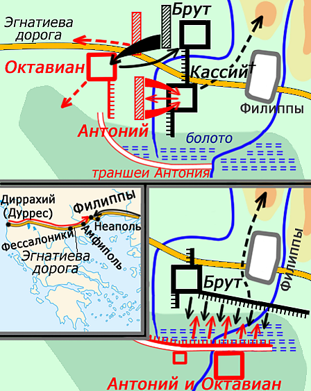 Летом 42 года до н. э. Брут и Кассий объединили свои армии в Сардах (при этом каждый из них остался во главе своей части войска, и главнокомандующий не был назначен). Им предстояло сразиться с Антонием и Октавианом, готовившимися к высадке на Балканах. У республиканцев был сильный флот, которым командовали Луций Стаций Мурк и Гней Домиций Агенобарб, но они не смогли помешать переправе цезарианцев, а сухопутные войска не попытались встретить врага в Эпире — прежде, чем тот выйдет на стратегический простор. Это был серьёзный просчёт Брута и Кассия[239]. Республиканская армия переправилась через Геллеспонт и только начала движение по Фракии, когда путь ей преградил сильный авангард цезарианцев — восемь легионов под командованием Луция Децидия Саксы и Гая Норбана Флакка, прошедшие форсированным маршем по Эгнациевой дороге и занявшие неприступное Сапейское ущелье[240]. Благодаря помощи фракийского царя Раскупорида Брут и Кассий смогли обойти позиции цезарианцев по пути, считавшемуся до этого непроходимым; тем пришлось отступить к городу Филиппы. Вскоре к Филиппам подошло войско Антония, а десятью днями позже — войско Октавиана[241][242][239].