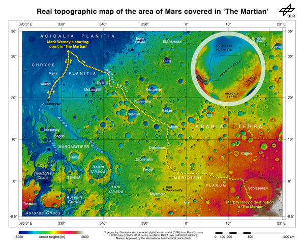Корабль Hermes в картине имеет внушительные размеры. Очевидно, действие в картине происходит в ближайшем будущем[6] и маловероятно, что человечество будет способно вывести на околоземную орбиту и затем отправить к Марсу корабль таких размеров и массы. Неправдоподобным выглядит и то, что от команды Ares III долгое время скрывали факт выживания Уотни. Современные астронавты общаются с родными, с многочисленной службой поддержки, врачами; выходят в интернет. Держать их в неведении относительно того, что знает каждый человек на Земле, невозможно[38][103]. Создатели картины допустили забавную оговорку, заметную, впрочем, только подготовленным англоязычным зрителям картины. Герои картины, многие из которых сотрудники NASA, упоминая миссию на Марс, используют прилагательное manned (в английском означает как «мужчину», так и «человека»), тогда как NASA официально рекомендует использовать гендерно-нейтральное human (в русском языке в обоих случаях имеется в виду «пилотируемый»)[103][104].