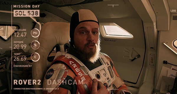 Также для съёмок использовались экшн-камеры GoPro Hero 4[38][39], которые вешали на шлемы астронавтов, монтировали внутри декораций, на ровере. Экшн-камеры дали возможность погружения зрителя в атмосферу событий, создав дополнительное визуальное измерение[37]. Поначалу создатели определили экшн-камерам вспомогательную роль, для заполнения пауз (в фильмах нередко эту роль выполняют камеры наружного наблюдения). Однако, после анализа картинки и некоторого пересмотра визуальной концепции в связи с видеодневником, материал снятый GoPro занял значительное место в окончательном монтаже[36]. В первоначальном сценарии большую роль должен был играть закадровый рассказчик, но фильм от этого явно не выигрывал. Видеодневник решил проблему и добавил развлекательное начало в картину[14].