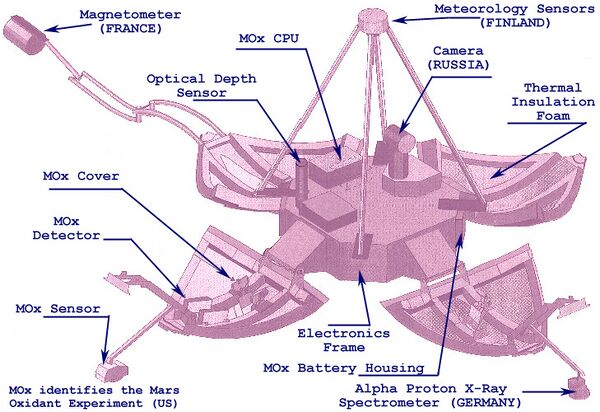 - Две малые автономные станции, совершающие посадку на поверхность Марса. Состав научной аппаратуры: панорамная камера, масс-спектрометр, альфа-спектрометр, гамма-спектрометр, лазерный спектрометр, спектрофотометр, магнитометр, микротонометр, сейсмометр, метеорологические датчики.