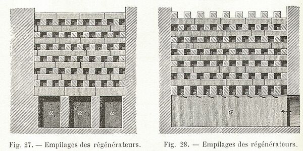 Из шлаковиков отходящие газы с температурой 1500—1600 °С попадают в насадки регенераторов. Объём насадки регенераторов и площадь поверхности её нагрева, то есть поверхности кирпича насадки, омываемой движущимися газами, взаимосвязаны. Эти величины определяют специальным теплотехническим расчётом, от них зависят основные показатели работы печи — производительность и расход топлива. Регенераторы должны обеспечивать постоянную высокую температуру подогрева газа и воздуха. В более тяжёлых условиях работают верхние ряды насадок, поскольку в этой части регенератора температура и осаждение пыли наиболее высокие, поэтому верхние ряды насадок выкладывают из термостойкого магнезитохромитового или форстеритового кирпича. Нижние ряды насадок работают при температурах 1000—1200 °С (и менее), их выкладывают из более дешёвого и прочного шамотного кирпича.
