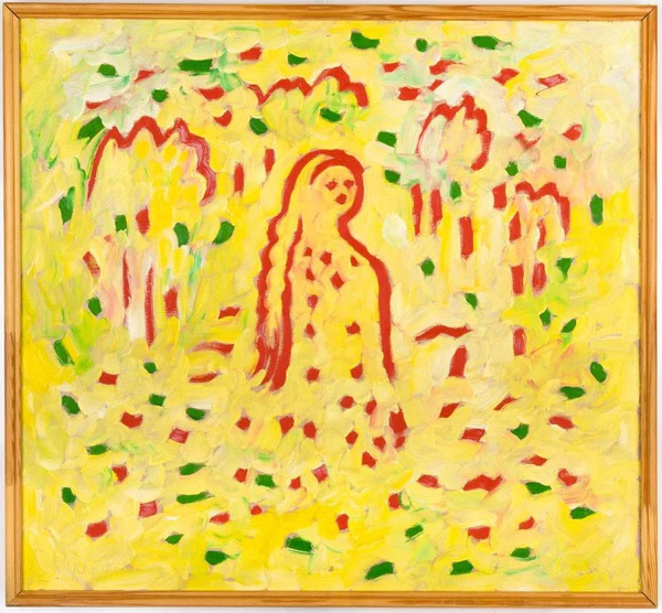 На жёлтом фоне размещён красный линейный силуэт девушки с длинной косой. По обе стороны от фигуры расположены контурные изображения деревьев, также выполненные красными линиями. Остальная часть композиции заполнена свободными мазками красного и зелёного цветов.