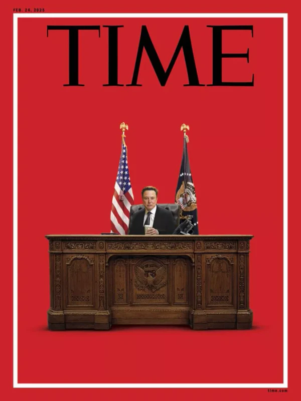 В 2025 году Time представил обложку февральского выпуска, на которой Маск изображён сидящим за столом «Резолют», за которым президент США работает в Овальном кабинете Белого дома. За спиной у него изображены два флага — Соединенных Штатов и флаг американского президента. Так издание отреагировало на обсуждения о влиянии Маска на администрацию Дональда Трампа[113].