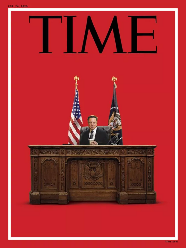 В 2025 году Time представил обложку февральского выпуска, на которой Маск изображён сидящим за столом «Резолют», за которым президент США работает в Овальном кабинете Белого дома. За спиной у него изображены два флага — Соединенных Штатов и флаг американского президента. Так издание отреагировало на обсуждения о влиянии Маска на администрацию Дональда Трампа[126].