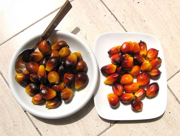 - Мякоть околоплодника содержит 22—70 % жирного масла (так называемое «пальмовое масло»). Оно оранжево-жёлтого цвета, в неочищенном виде содержит много каротиноидов, затвердевает при комнатной температуре. Используется в производстве мыла, свечей, маргарина.