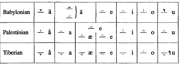 - Вавилонская, в которой знаки огласовок также помещались над согласными. Эта система имела простой и составной варианты.