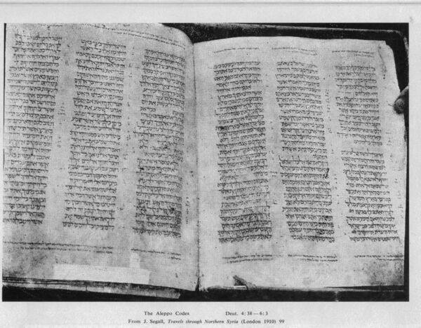 - Алеппский кодекс, включал все тексты Танаха; работа над ним велась в первой половине X века. В колофоне указано, что Аарон бен Моше бен Ашер занимался только огласовками и масоретским аппаратом, но не участвовал в переписывании текста. Кодекс сразу же приобрёл статус эталонного для масоретских учёных и для консультаций в текстологических целях; в литургических целях не использовался. Вначале хранился в Иерусалиме, далее был перевезён в Каир и Алеппо. При издании BHK Алеппский кодекс был недоступен его редакторам. В ходе погромов 1947 года кодекс был сильно повреждён, была утрачена примерно четвёртая часть всех листов (в начале текста до Втор 28:26, и от Песни Песней 3:12 до самого конца, включая Екклесиаста, Есфирь, Притчи, Даниила, Ездру и Неемию). В настоящее время хранится в Храме книги в Иерусалиме. Факсимильное издание опубликовано в 1976 году. Кодекс является основой для критического издания Танаха Еврейского университета Иерусалима[91].