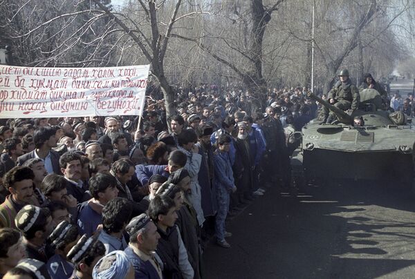 После распространения слухов о выделении квартир армянским беженцам 11 февраля возле здания ЦК КП Таджикистана на площади Ленина (Шахидон) собралось более 4 тысяч человек. Несколько семей армян, приехавших в Душанбе, заявили, что не хотят стать причиной бед таджикского народа, и покинули республику[8][2]. Уже на следующий день выкрики в толпе «Долой армян!» сменились требованиями «Долой Махкамова!» (первый секретарь ЦК КП Таджикистана). Демонстранты прорвались в здание и подожгли его. К вечеру в ответ на открытие огня милицией холостыми патронами начались поджоги ларьков, погромы магазинов[9]. В этот же день в Душанбе было объявлено чрезвычайное положение.