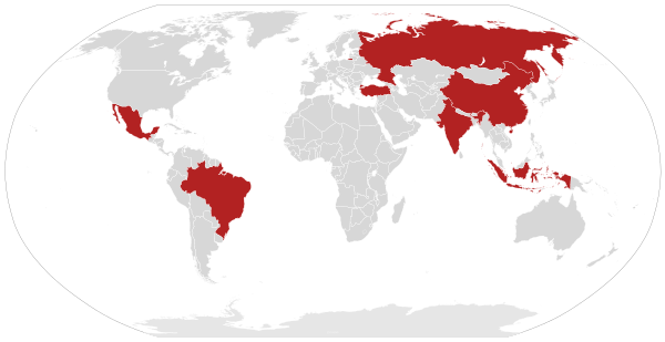 В условиях замедления экономического роста на развитых рынках транснациональные корпорации всё больше обращают внимание на развивающиеся рынки, где они ищут новые возможности для развития и экономии за счёт масштаба[39]. В некоторых регионах Азии, Африки, Южной Америки и Восточной Европы, где наблюдается стремительный рост населения, развитие экономики и повышение уровня жизни, формируется новый класс потребителей — средний класс[40]. Это открывает перед компаниями огромные перспективы для долгосрочного развития[41].