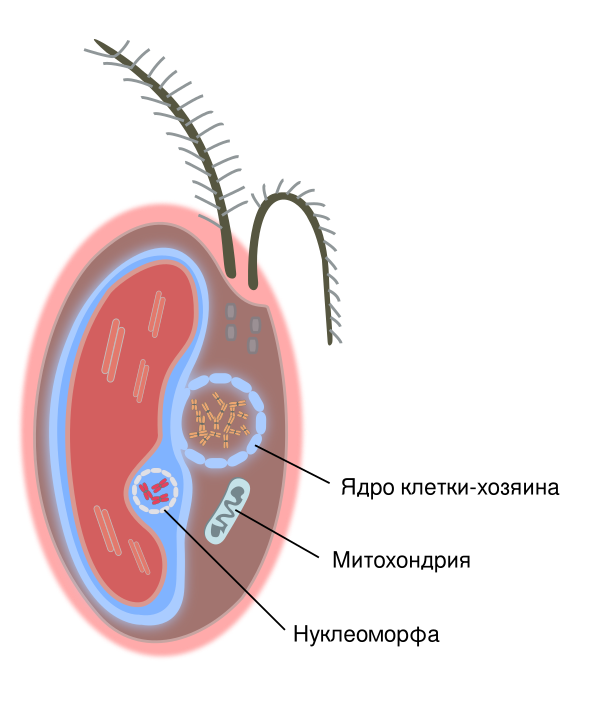 У одной из групп криптист — криптофитовых водорослей — есть двучленные мастигонемы (состоящие из трубчатой основной части и одного или нескольких тонких концевых волосков). Таким строением они отличаются от мастигонем всех остальных организмов[6]. У Hemiselmis, в отличие от других криптофитов, волоски (разной длины) есть и на трубчатой части мастигонем[10]. Как правило, мастигонемы криптофитов расположены двумя рядами на длинном жгутике (где они имеют длину около 1,5 мкм) и одним — на коротком (где они короче — около 1,0 мкм — и могут иметь другое количество и длину концевых волосков)[11][10]. Встречаются и другие варианты их расположения[5].