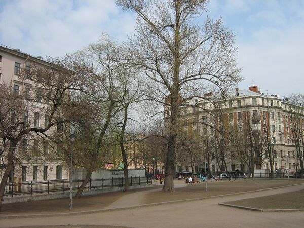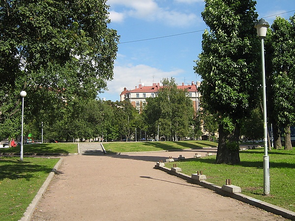 Приблизительно в центре сада находится невысокий холм. Приблизительно на его месте до 1932 года находилась церковь апостола Матфия и Покрова Пресвятой Богородицы [5] (конец XVIII — начало XIX века, арх. Л. И. Миллер). В 1923 году храм получил статус собора, а в 1932 году был закрыт и взорван по постановлению Леноблисполкома[6]. Обломки были сгруппированы в центре и засыпаны, в результате чего образовался существующий холм.