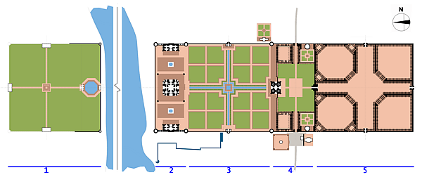 Комплекс Тадж-Махал был вычерчен на решётке, разделённой на более мелкие решётки. Ширина комплекса составляет 374 монгольских ярдов или зир[f]. Главная часть составляет три квадрата по 374 ярда. Они были разделены в местах базаров и караван-сараев на модули по 17 зир. Сад и террасы разделены на модули по 23 зиры шириной 368 зир (16 x 23). Мавзолей, мечеть и гостевой дом вычерчены на решётке 7 зир. Кох и Барро заметили, что если восьмиугольник, использованный неоднократно в комплексе, имеет стороны 7 единиц, тогда он имеет ширину 17 единиц[g], что может помочь объяснить выбор отношений в комплексе [82].