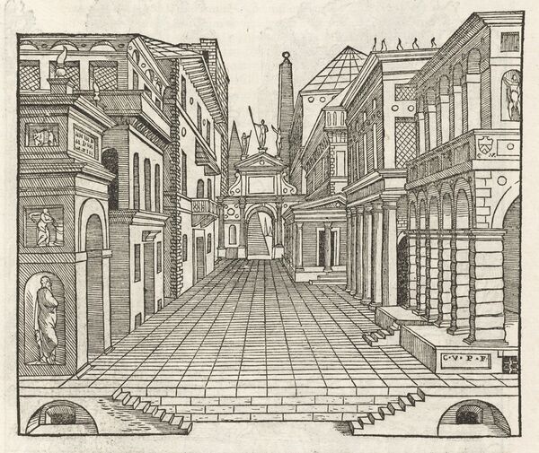 Следующим важным текстом была книга Себастьяна Серлио Regole generali d’architettura (Основные правила архитектуры). Первый том книги вышел в Венеции в 1537 году. Том 1545-го года (книги 1 и 2) охватывают геометрию и перспективу. Два метода построения перспективы Серлио были ошибочными, но это не остановило широкое использование книги[39].