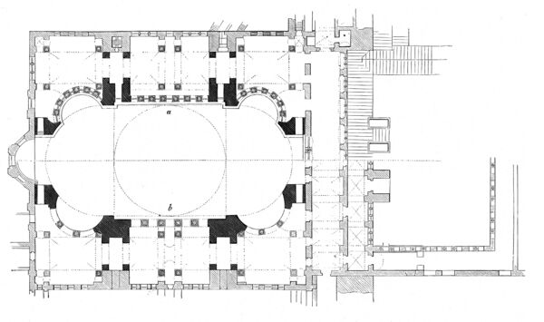 Мечеть Селимие в городе Эдирне, Турция, была построена Мимаром Синаном таким образом, что михраб можно видеть с любой точки внутри здания. Очень большое внутреннее пространство оформлено в виде восьмиугольника, образованного 8 огромными столбами и покрытого круглым куполом диаметром 31,25 метр и высотой 43 метра. Восьмиугольник образован внутри квадрата с четырьмя полукуполами и четырьмя исключительно высокими (83 метра) минаретами. План здания выглядит как круг внутри восьмиугольника внутри квадрата[78].