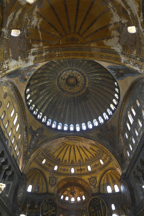 Собор Святой Софии в городе Византий (ныне Стамбул), построенный в 537 году (и дважды перестроенный), был в течение тысячи лет[h] наибольшим кафедральным собором. Он стимулировал постройку многих более поздних зданий, включая Мечеть Султанахмет и другие мечети города. Архитектура Византии включает притвор, увенчанный круглым куполом и двумя полукуполами одного диаметра (31 метр), с пятью меньшими полукуполами, образующими апсиду и четыре круглых угла просторного прямоугольного внутреннего пространства[83]. Это интерпретировалось средневековыми архитекторами как представление земного внизу (квадратное основание) и святых небес сверху (устремлённый ввысь сферический купол)[84]. Император Юстиниан I использовал двух геометров, Исидора Милетского и Анфимия из Тралл, в качестве архитекторов. Исидор Милетский собирал труды Архимеда по стереометрии, которые оказали на него большое влияние[5][85].