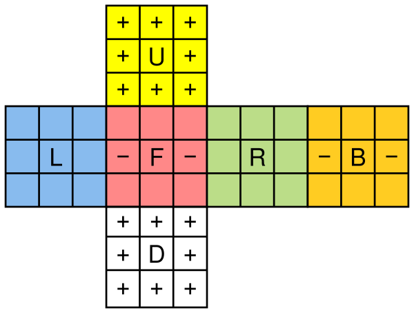 Буквы обозначают поворот на 90° по часовой стрелке левой (left), правой (right), передней (front), задней (back), верхней (up) и нижней (down) граней соответственно. Повороты на 180° обозначаются добавлением справа к букве цифры 2 или верхним индексом 2 справа от буквы. Поворот на 90° против часовой стрелки обозначается штрихом ( ′ ) или добавлением верхнего индекса −1 справа от буквы. Записи и эквивалентны, как и и .
