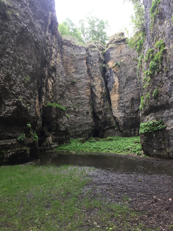 В нескольких километрах от смотровой площадки расположен еще один природный памятник, получившее название "Каменная чаша"[9]. Это теснина, окруженная скалами, протяженность которого составляет 90 м, в высоту она достигает 30 м, в ширину — 17 м. Стены теснины расписаны разными природными красками и мхом. На дне "Каменной чаши" даже в самую жаркую погоду прохладно, поскольку сюда не попадают солнечные лучи[10].