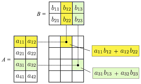 Произведение двух матриц A (размера m×n) и B (размера n×p) определено, если число столбцов A равно числу строк B. Результирующая матрица размера m×p вычисляется как: Умножение ассоциативно, но не коммутативно: \mathbf{AB} \neq \mathbf{BA}.
